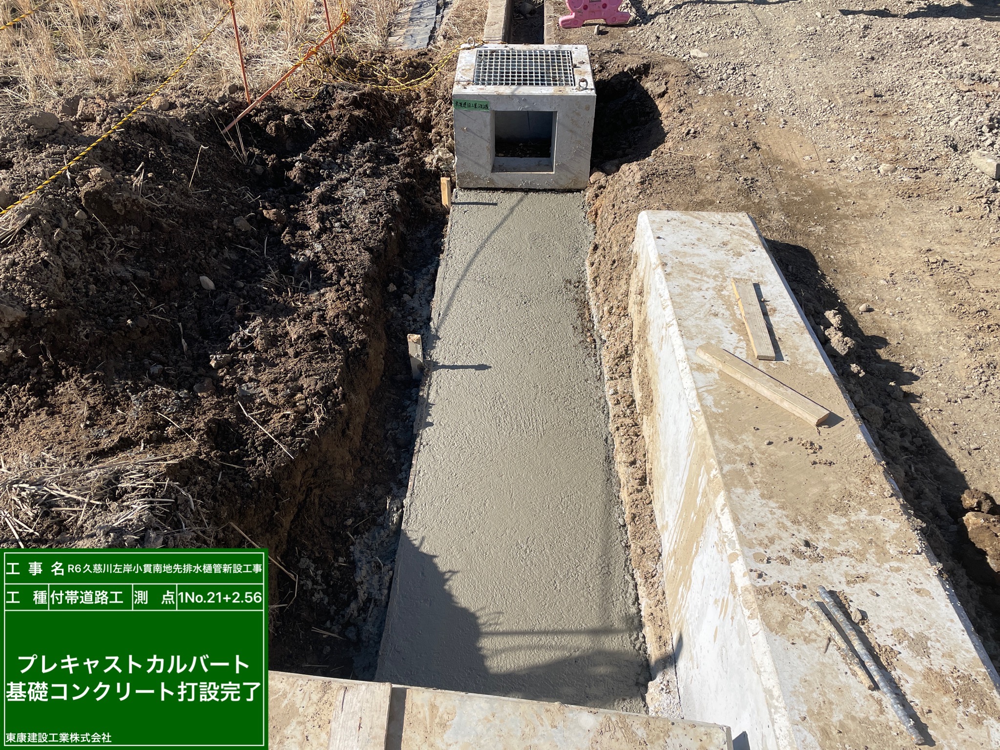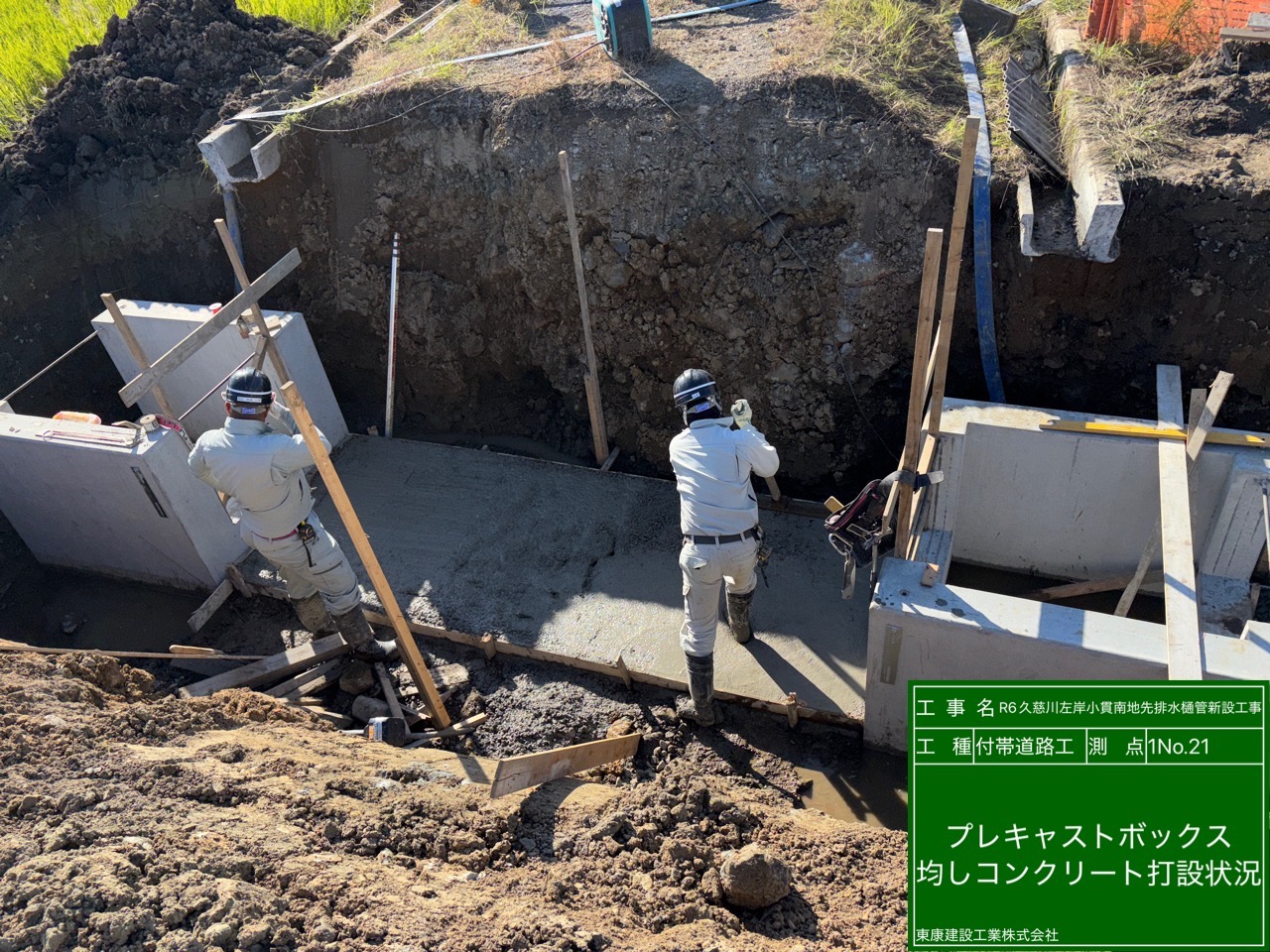 打設後は、変位確認。床堀、遮水壁部分に均しコンクリートを打設しました。