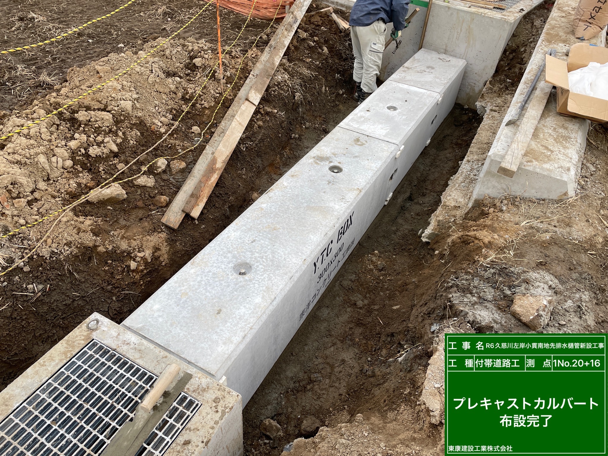 右写真1枚目写真📷は、PC鋼棒をPC函渠へ挿入している様子。