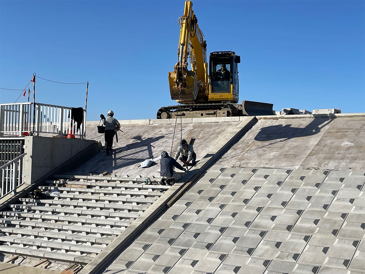ブロック積みも順調に進み、ブロック同士を連結させる作業へと入りました。