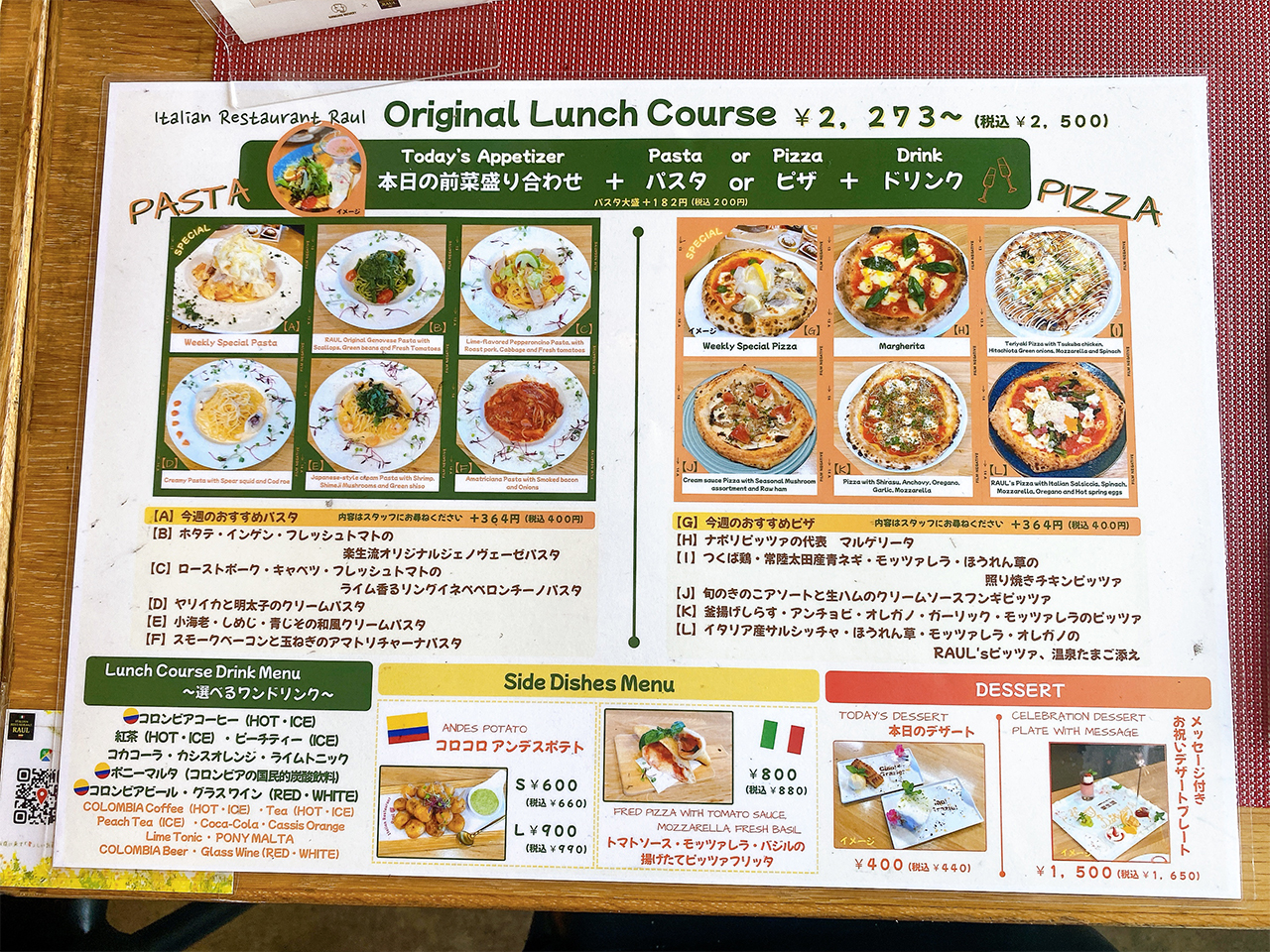 案内された席に座ると店員さんがメニューにあるランチオリジナルコースの本日の前菜盛り合わせとおすすめのパスタとピザの説明をしてくださいました。