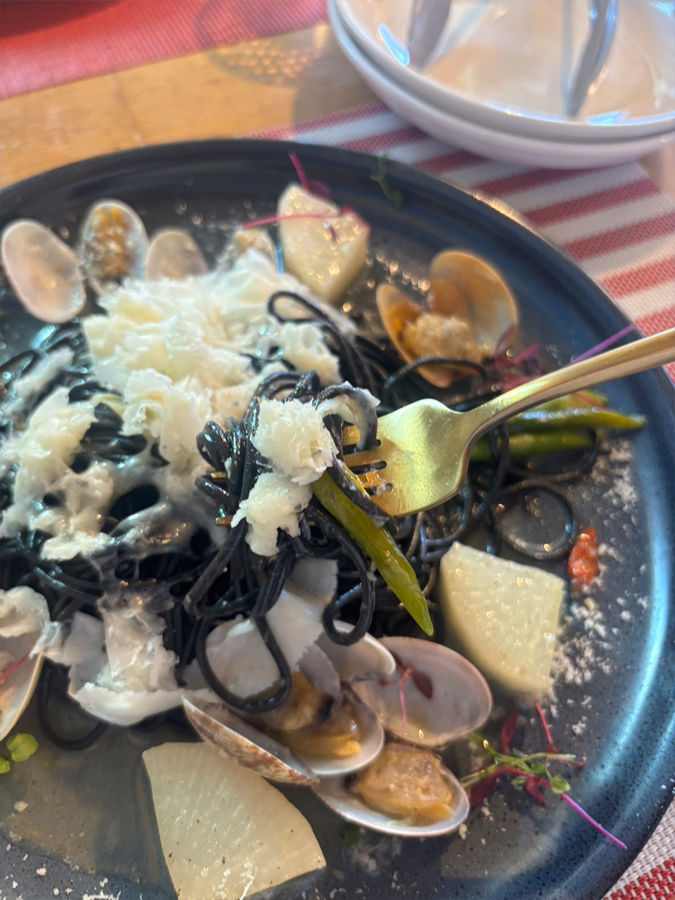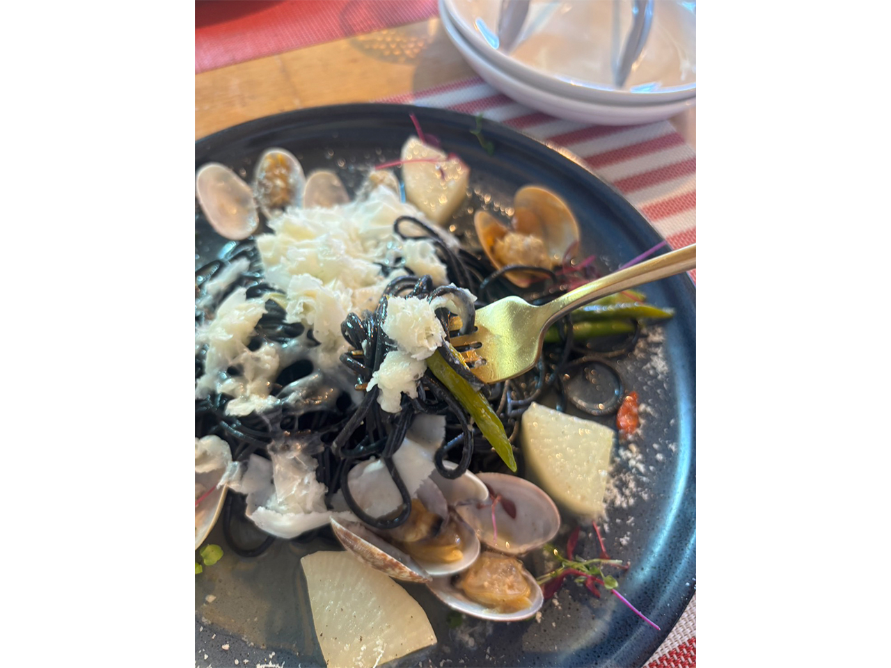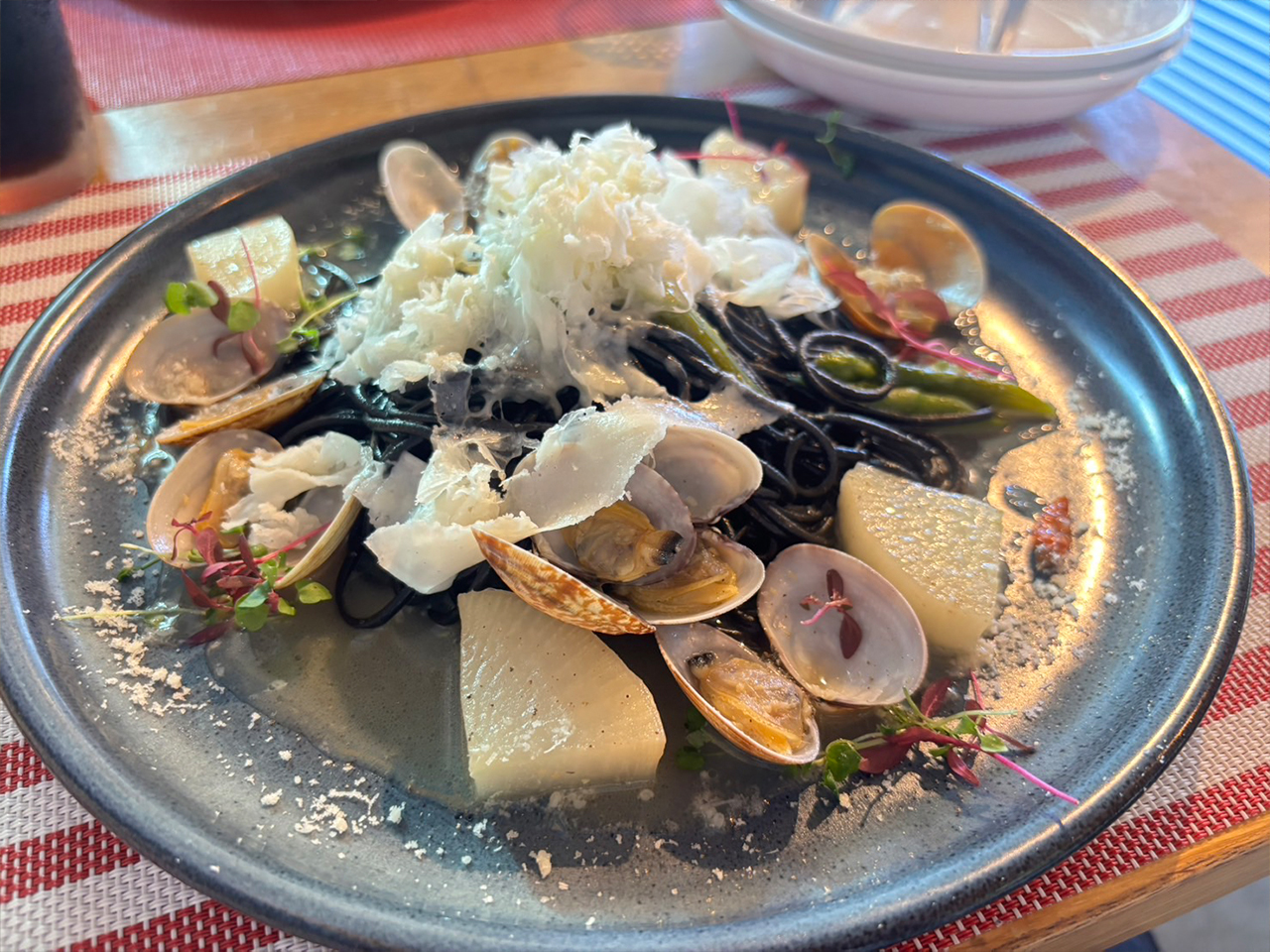 来た時に麺が黒くてびっくり!?イカスミのパスタでした。他にもあさりや大根、アスパラが入っています。
