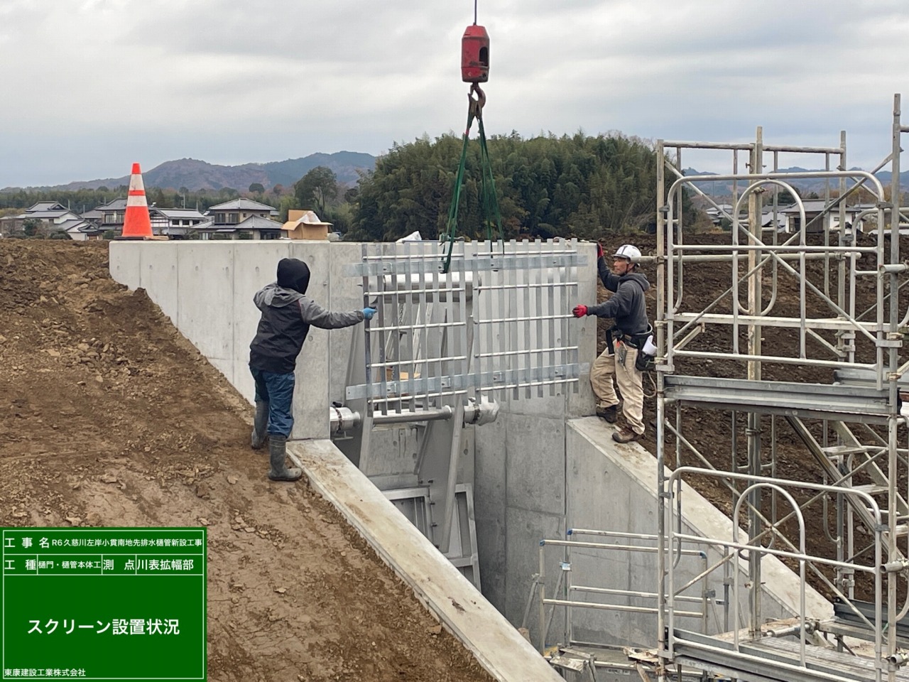 オートゲート、スクリーン、防護蓋などなど…部材をクレーンで吊り上げて据付けます。