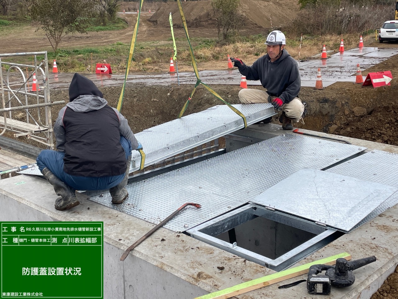 右写真1枚目写真📷は、PC鋼棒をPC函渠へ挿入している様子。