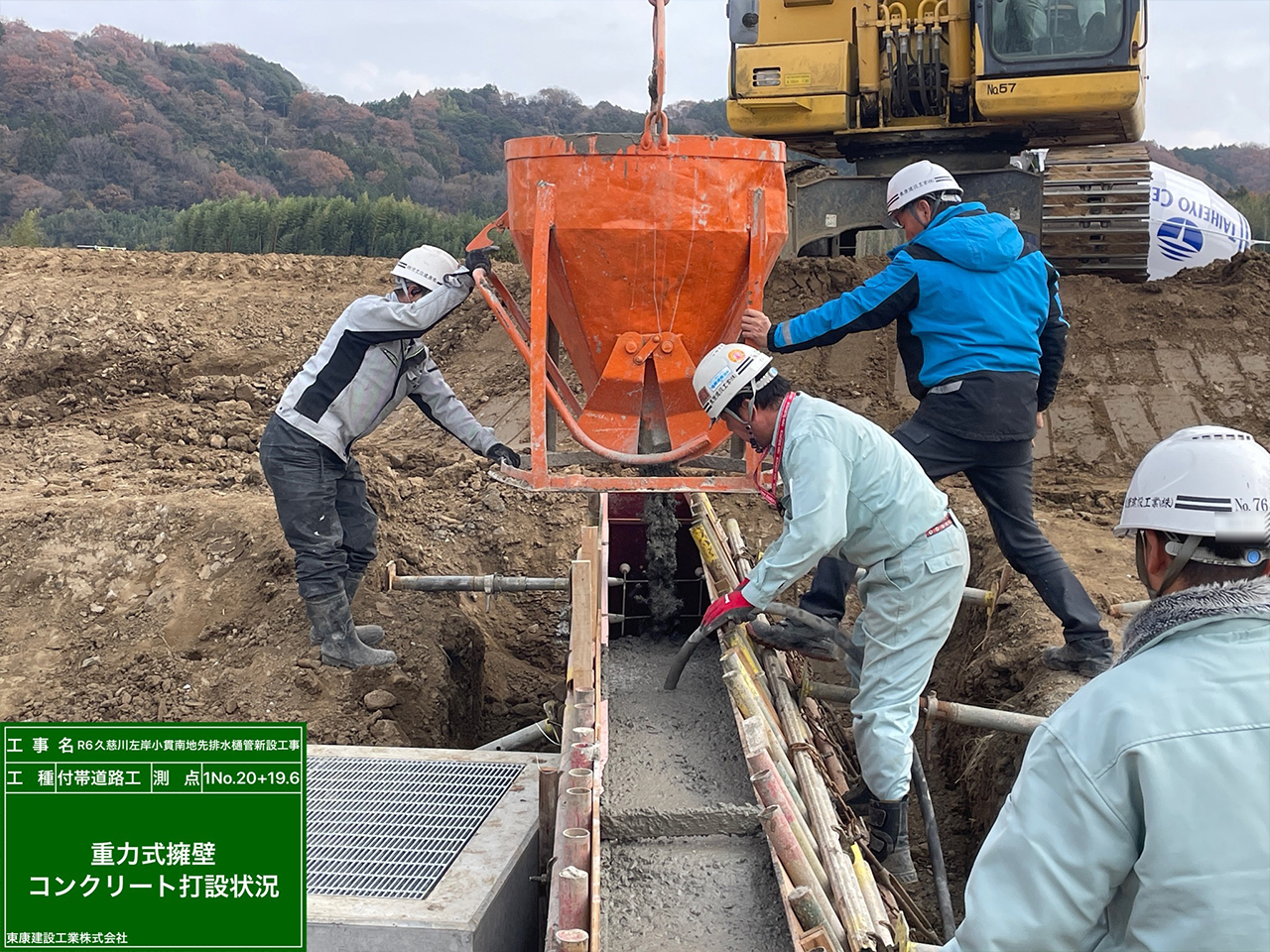 打設後は、変位確認。床堀、遮水壁部分に均しコンクリートを打設しました。